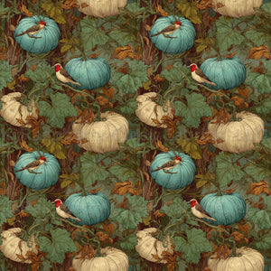 Wild Blue And White Autumn Pumpkins With Woodpeckers In The Forest