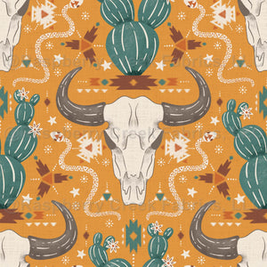 Explore the rugged beauty of the Wild West with this Western fabric featuring iconic buffalo skulls, rattlesnakes, and desert cacti. Perfect for rustic apparel, home decor, quilts, and accessories, this design captures traditional Southwestern spirit with bold geometric and natural motifs. Ideal for lovers of cowboy style, tribal patterns, and desert-inspired prints.