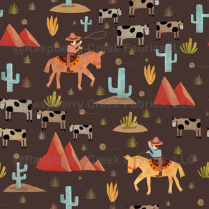 Dive into the Old West with cowboys, horses, and desert views over a dark brown background.