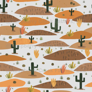 Desert tableau featuring cacti, sand dunes, and plant life over a white background.