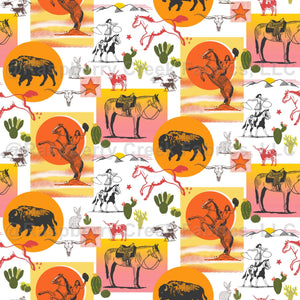 Wild West vintage cowgirls and horses in orange and pink on a white background.