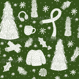 Winter woods holiday scene with fluffy sweaters, firewood, holly leaves, scarves, hot cocoa
