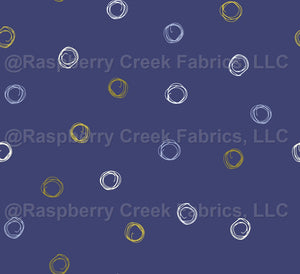 Ivory, periwinkle. and ochre hand-drawn wispy polka dots on a dark indigo-blue background.