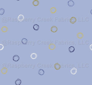 Ivory, indigo, and ochre hand-drawn wispy polka dots on a periwinkle background.