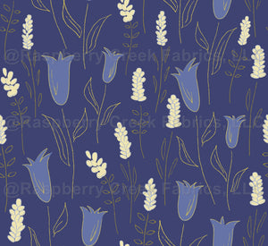Periwinkle tulips and vanilla cream hyacinths bloom on a deep indigo-blue background.