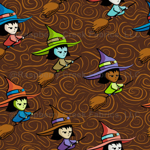 Adorable coven of witches flying through the night on their broomsticks. Brown background.