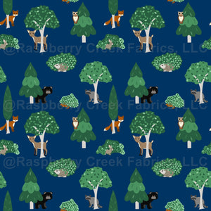 Woodland Animals - Forest Creatures - Peekaboo Forest Collection - Trees Deer Bear Raccoon Hedgehog Chipmunk Rabbit Owl Fox - Navy Blue Taupe Rust Forest Green Gray Cream