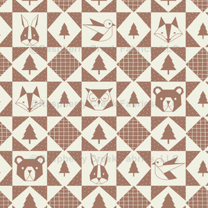 A modern cheater quilt featuring simple geometric woodland bear, fox, owl, bunny, and trees in Pantone Mocha Mousse and cream for a warm cozy look