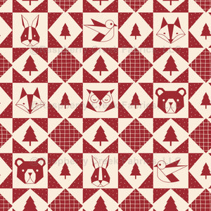 A modern cheater quilt featuring simple geometric woodland bear, fox, owl, bunny, and trees in red and cream for a bold, playful design.