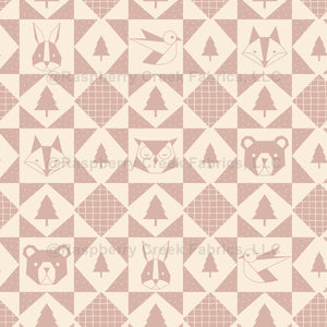 A modern cheater quilt featuring simple geometric woodland bear, fox, owl, bunny, and trees in soft taupe and cream for a warm, elegant design.