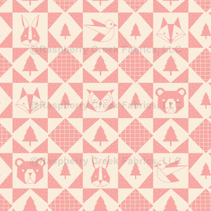 A modern cheater quilt featuring simple geometric woodland bear, fox, owl, bunny, and trees in sweet peach and cream for a soft and sweet look.