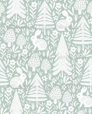 Woodland inspired design featuring rabbits, pine trees, and mushrooms in sage green, perfect for nature-themed crafts and decor.