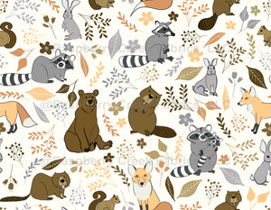 Hand drawn woodland animals. Bear, beaver, rabbits, squirrels, fox and raccoons with forest flowers and leaves.