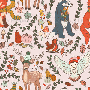 Woodland friends wallpaper on barely blush pink | forest animals, fox, badger, deer, owl, mushrooms, foliage,