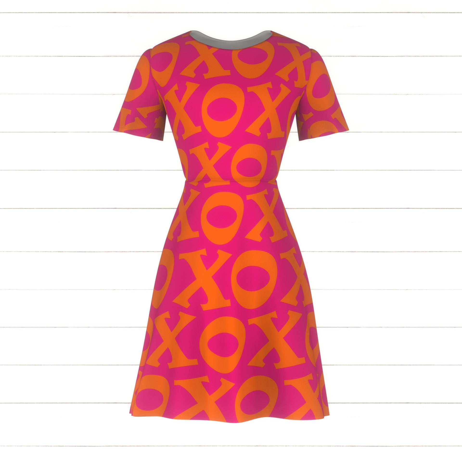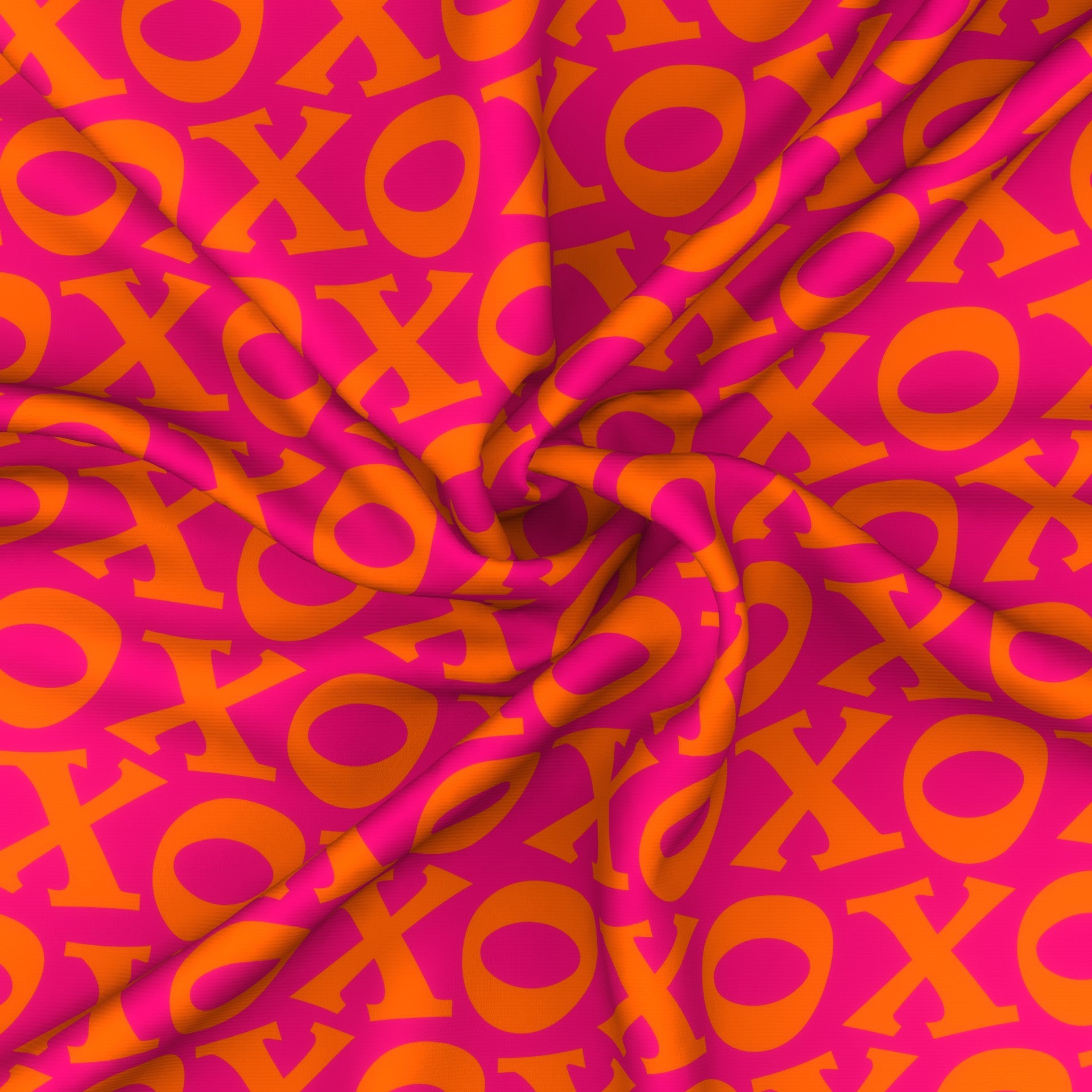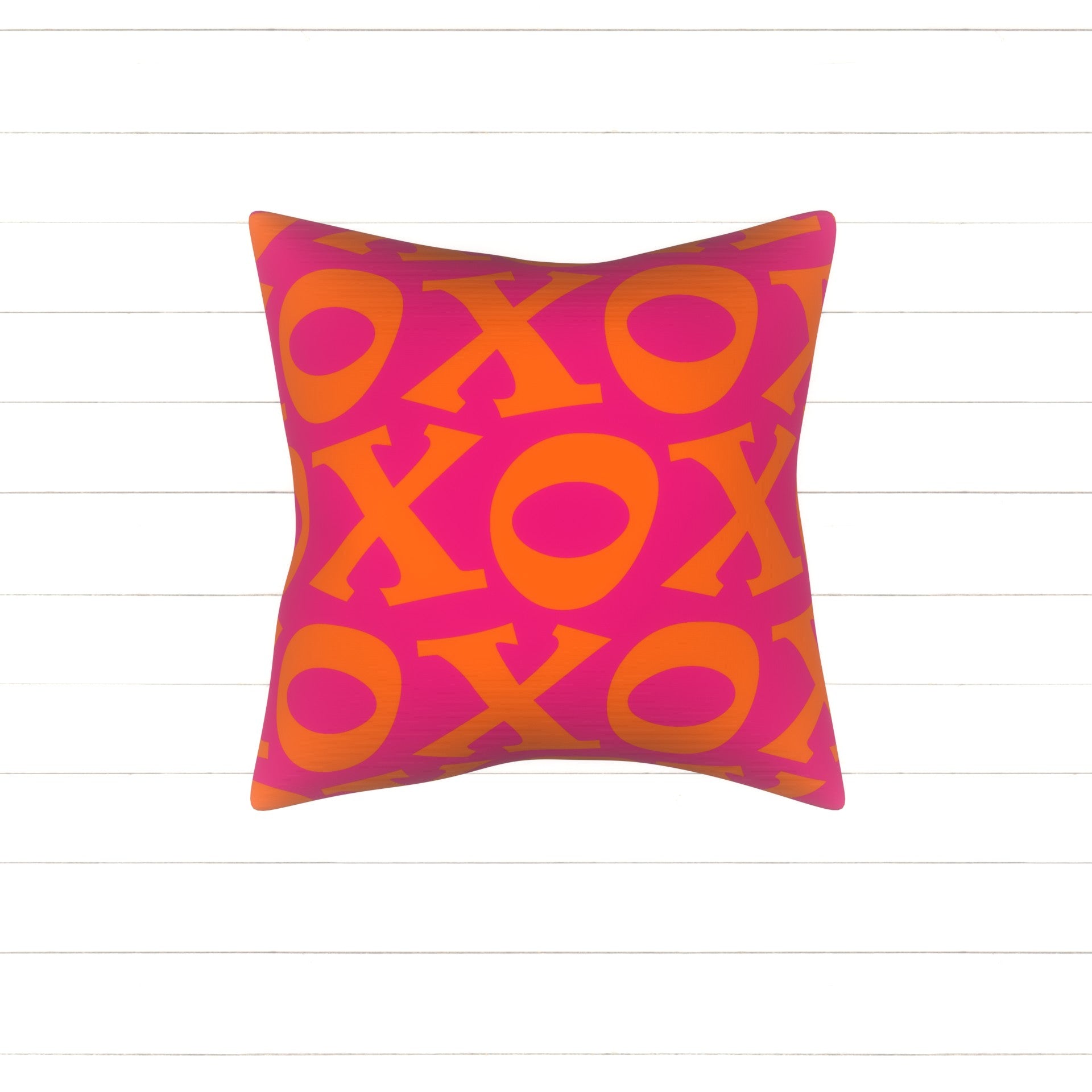 XO XO - in vivid fuschia pink and orange. Symbol for hugs & kisses, love. Friendship on Valentines day, fun kids' room, dopamine rush accent pillows. (c)CRL 2023, Font licensed. (Colors may soak into textiles differently -- see guidelines).