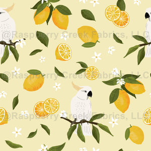 A happy summer vibes pattern made with lemons, lemon blossoms andleaves. The white cockatoos lend a tropical feeling to the design.