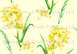 Hand-drawn in fine lines and colored by hand, this pattern celebrates the charm of golden lilies with delicat yellow background.