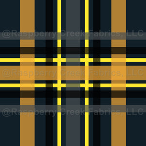 Yellow, orange, black and grey tartan, against a dark teal background.