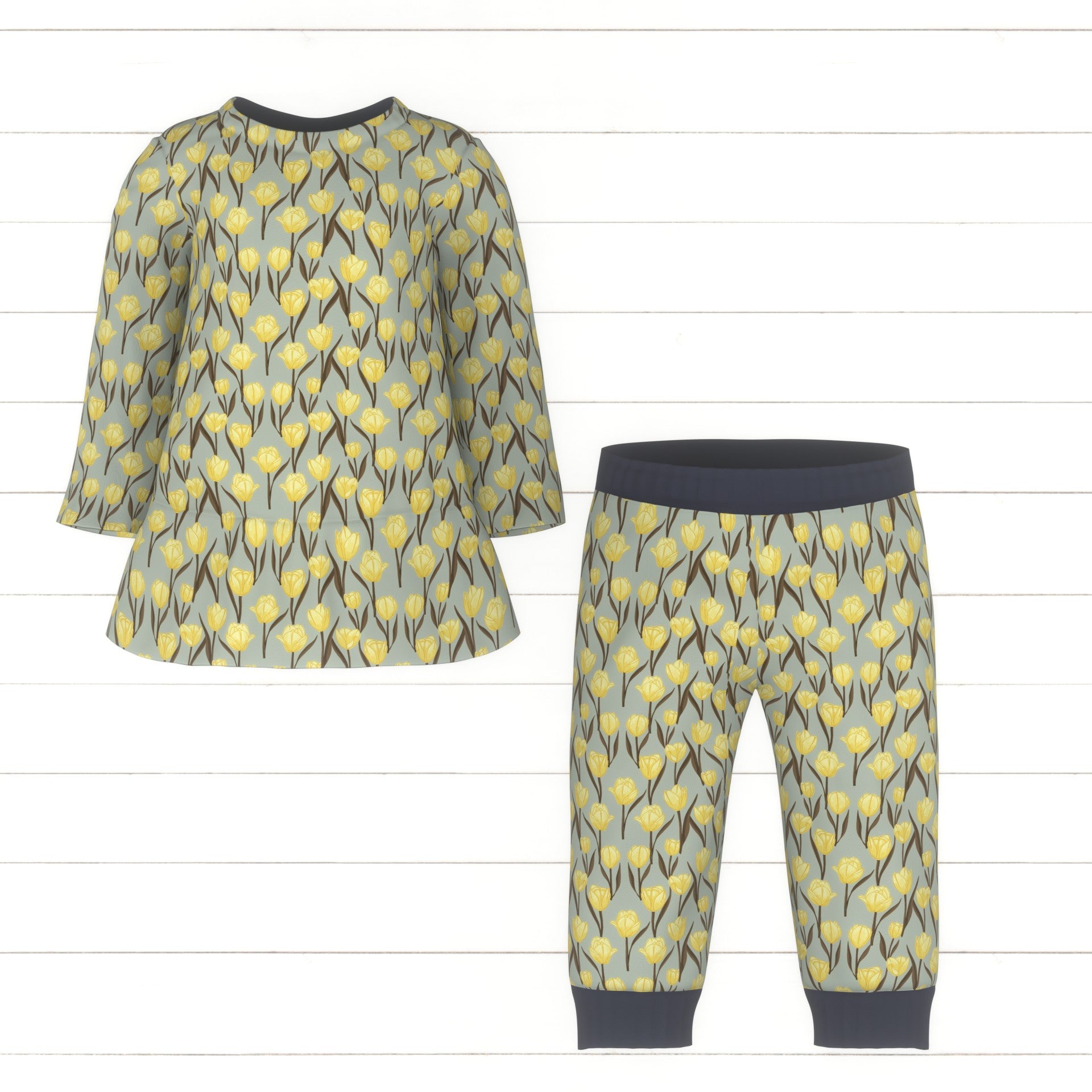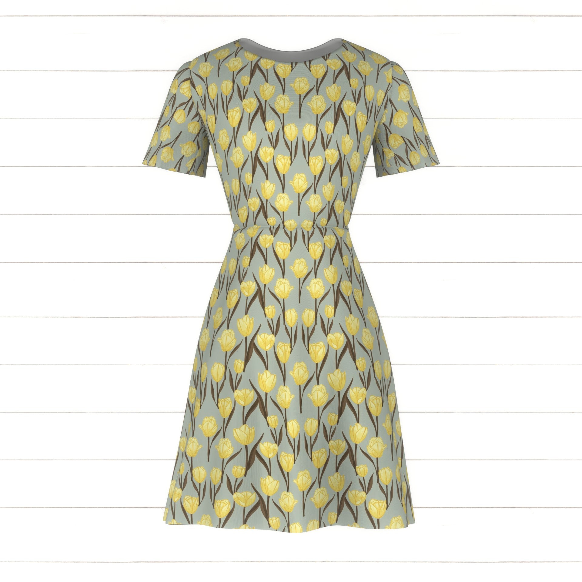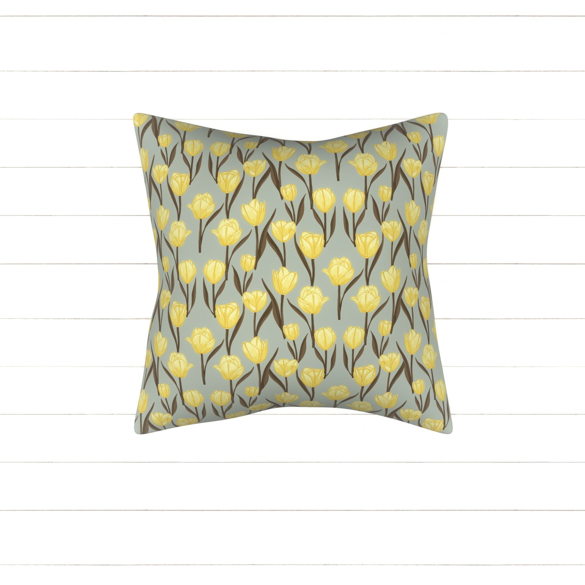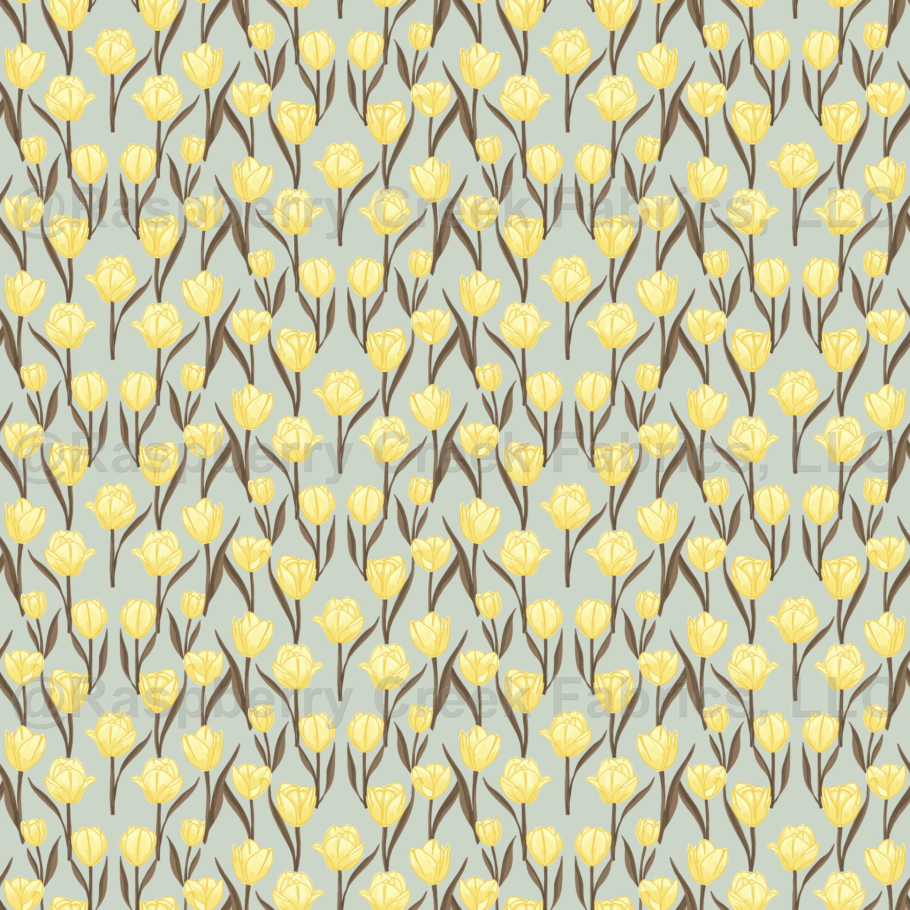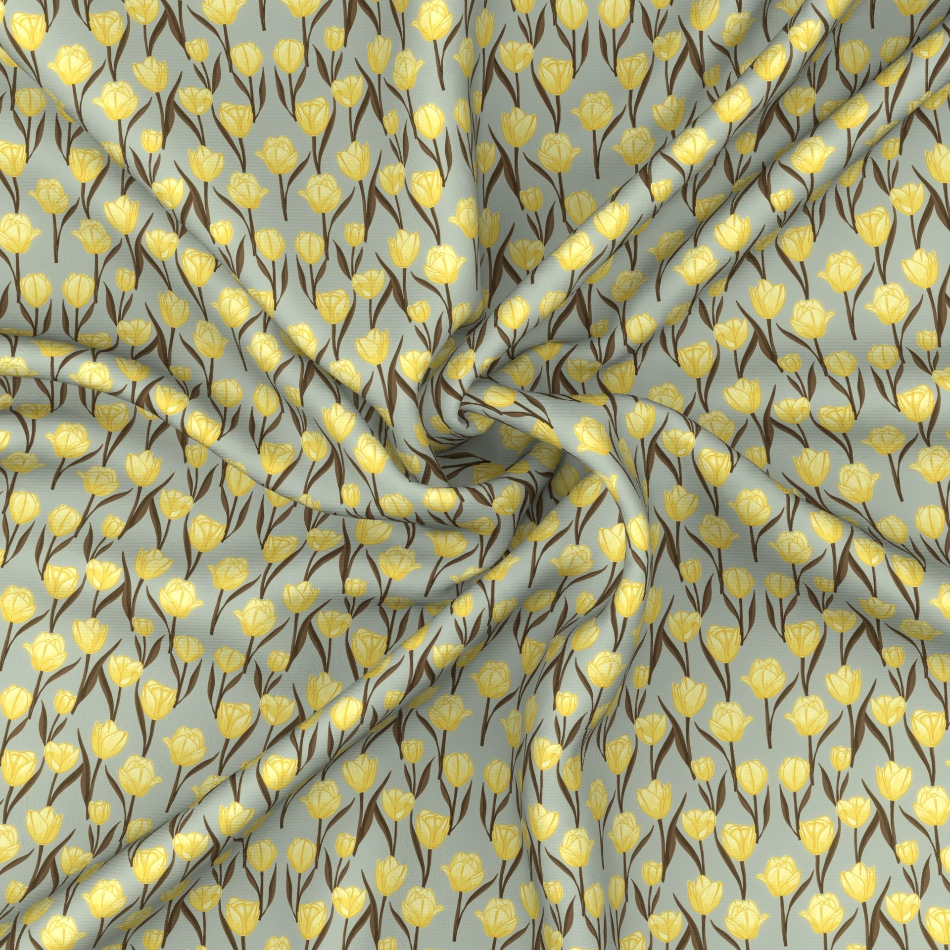 Tulip Garden with yellow tulips on a light blue color background. Textured tulip flowers directional pattern.