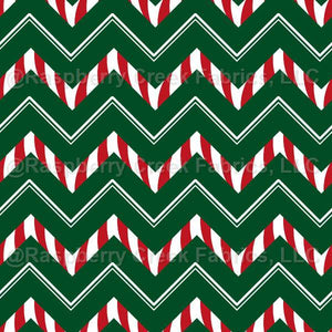 Zig-Zag Candy Cane: A christmassy green backdrop sets the stage for bold zig-zag lines in classic candy-cane red and white, interspersed with varied white lines, adding playful contrast and depth. Geometric design for fun and playful christmas apparel.