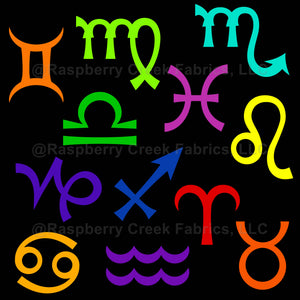 Cute, fun and adorable pattern with colorful zodiac signs on black background. Modern and trendy design, perfect for the astrology lover.